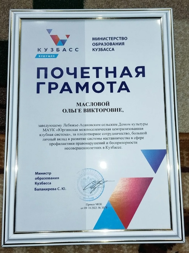Маслова Ольга награждена Почетной грамотой Министра образования Кузбасса за плодотворное сотрудничество, большой личный вклад в развитие системы наставничества в сфере профилактики правонарушений и беспризорности несовершеннолетних в Кузбассе.